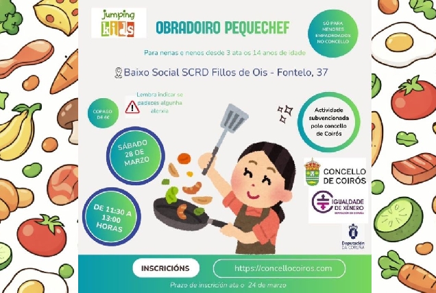 O Concello de Coirós organiza o sábado 28 de marzo unha sesión de 'Pequechef' para nenos e nenas de 3 a 14 anos no baixo social da SCRD Fillos de Ois, cun copagamento de 6 euros e inscrición aberta ata o 24 de marzo