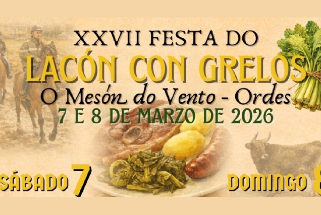 O Mesón do Vento, en Ordes, acollerá o 7 e 8 de marzo a XXVII Festa do Lacón con Grelos, coa estrea da I Feira de Maquinaria Agrícola de Segunda Man e un domingo marcado polas probas de andadura e a poxa de gando frisoa