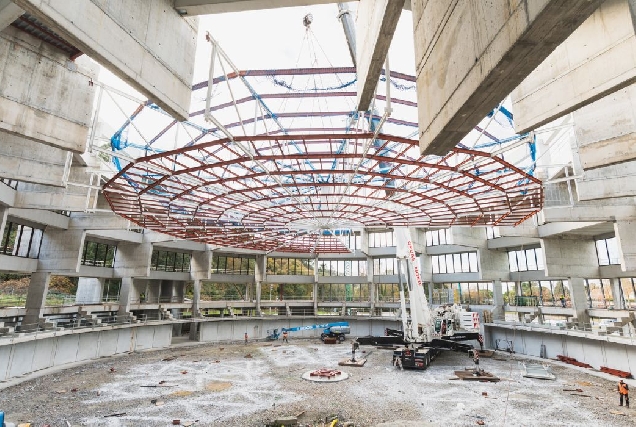 Un guindastre especial elevou durante 8 horas unha estrutura de 750 toneladas que completará o futuro recinto cultural e deportivo, con capacidade para máis de 4.000 persoas