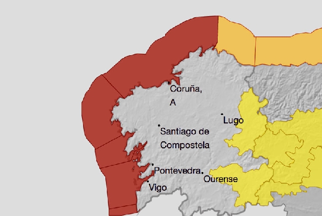 Activadas alertas laranxa e vermella en Galicia por fenómenos meteorolóxicos adversos