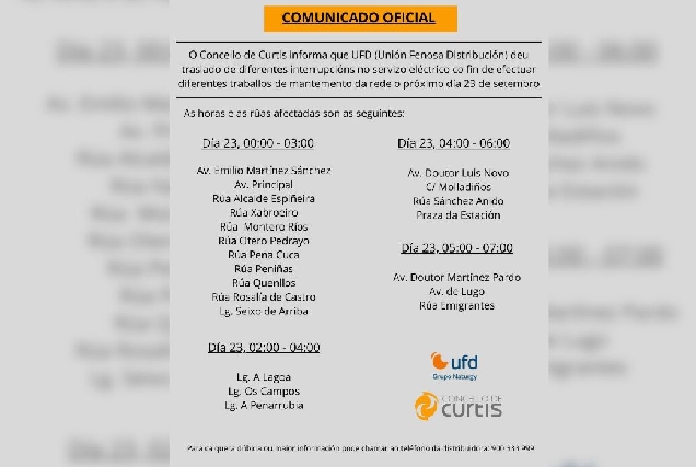 Curtis anuncia cortes de luz el 23 de septiembre por trabajos de mantenimiento de UFD