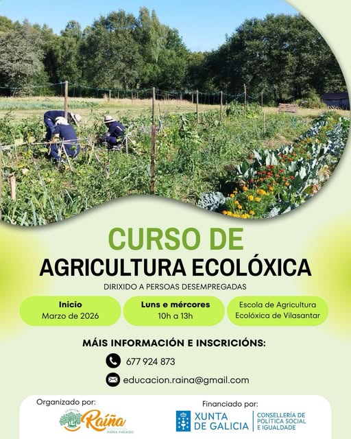 A Asociación Raiña Paraíso porá en marcha unha nova edición do curso de agricultura ecolóxica na Escola de Agricultura Ecolóxica de Vilasantar, unha iniciativa formativa orientada a persoas desempregadas interesadas no cultivo sostible e no desenvolvemento profesional no medio rural.