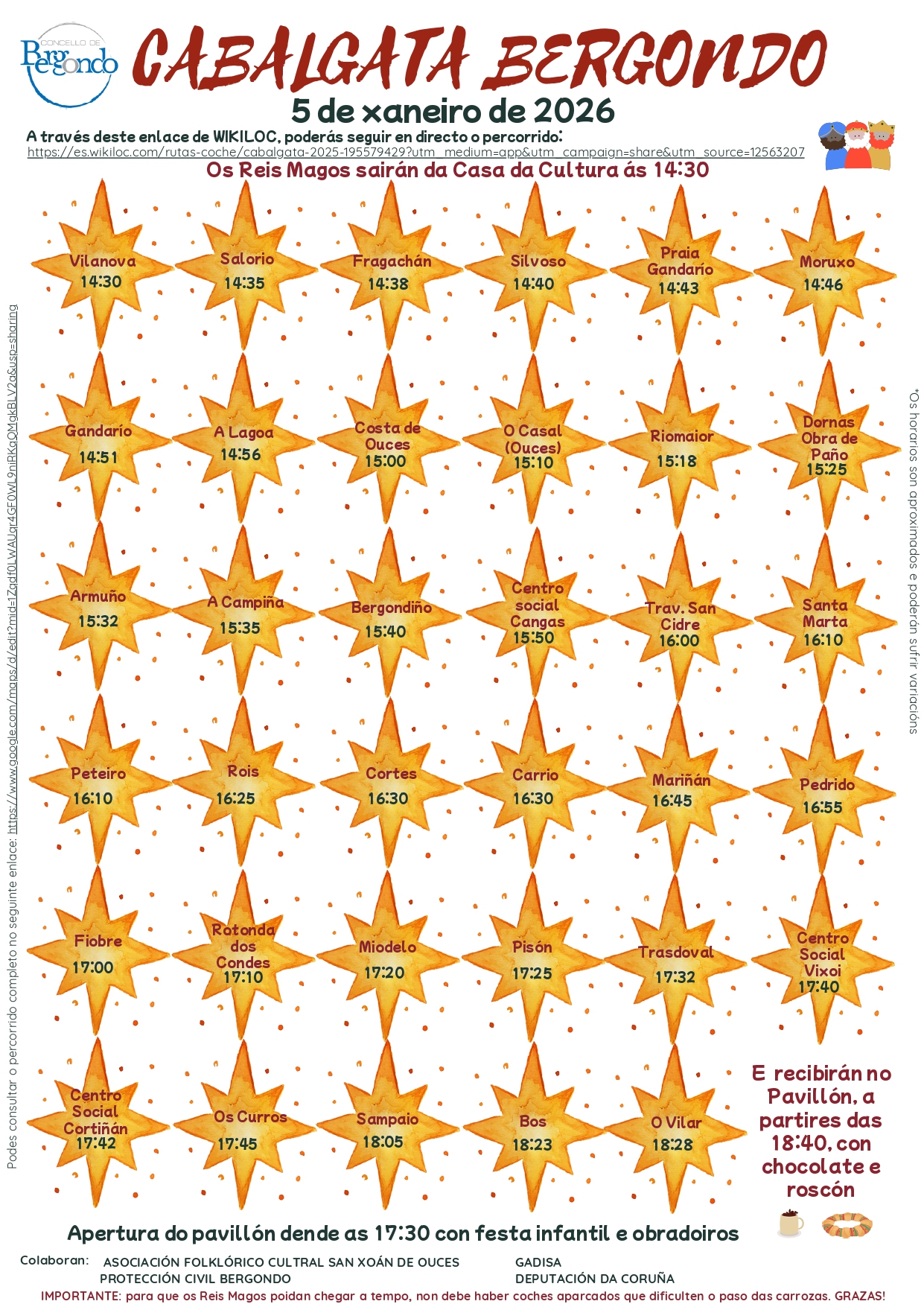 O Concello lembra que os horarios son aproximados e solicita colaboración veciñal para evitar estacionar no percorrido e facilitar o paso das carrozas. O itinerario completo pode consultarse na ligazón de Wikiloc, onde o propio día 5 tamén será posible seguir a cabalgata en tempo real.