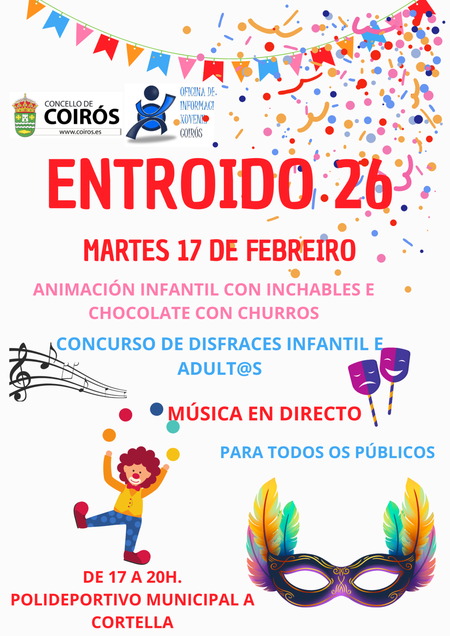 Coirós ultima os preparativos para a celebración do Entroido 2026, que terá a súa xornada central este martes 17 de febreiro no Polideportivo Municipal A Cortella. O Concello convida a veciñanza e visitantes a participar nunha festa gratuíta deseñada para todas as idades, con actividades concentradas entre as 17.00 e as 20.00 horas.