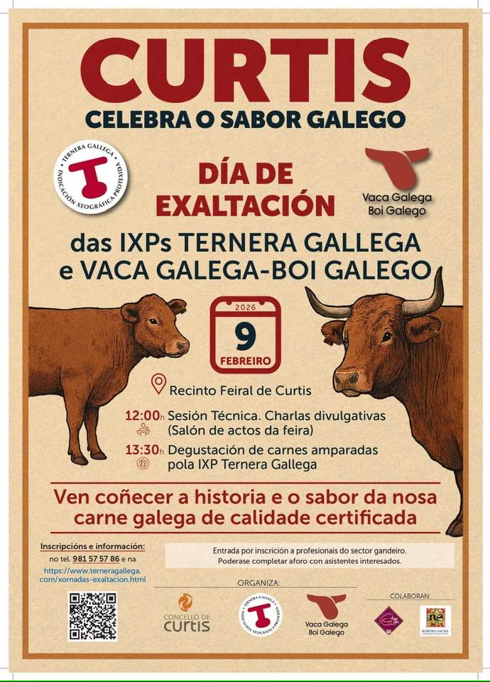 O Recinto Feiral de Curtis acollerá finalmente este luns 9 de febreiro a xornada de exaltación e formación arredor das indicacións xeográficas protexidas Ternera Gallega e Vaca Galega-Boi Galego, organizada polo Consello Regulador. A actividade estaba prevista inicialmente para finais de xaneiro, pero foi adiada polas predicións meteorolóxicas e retómase agora mantendo o mesmo programa.