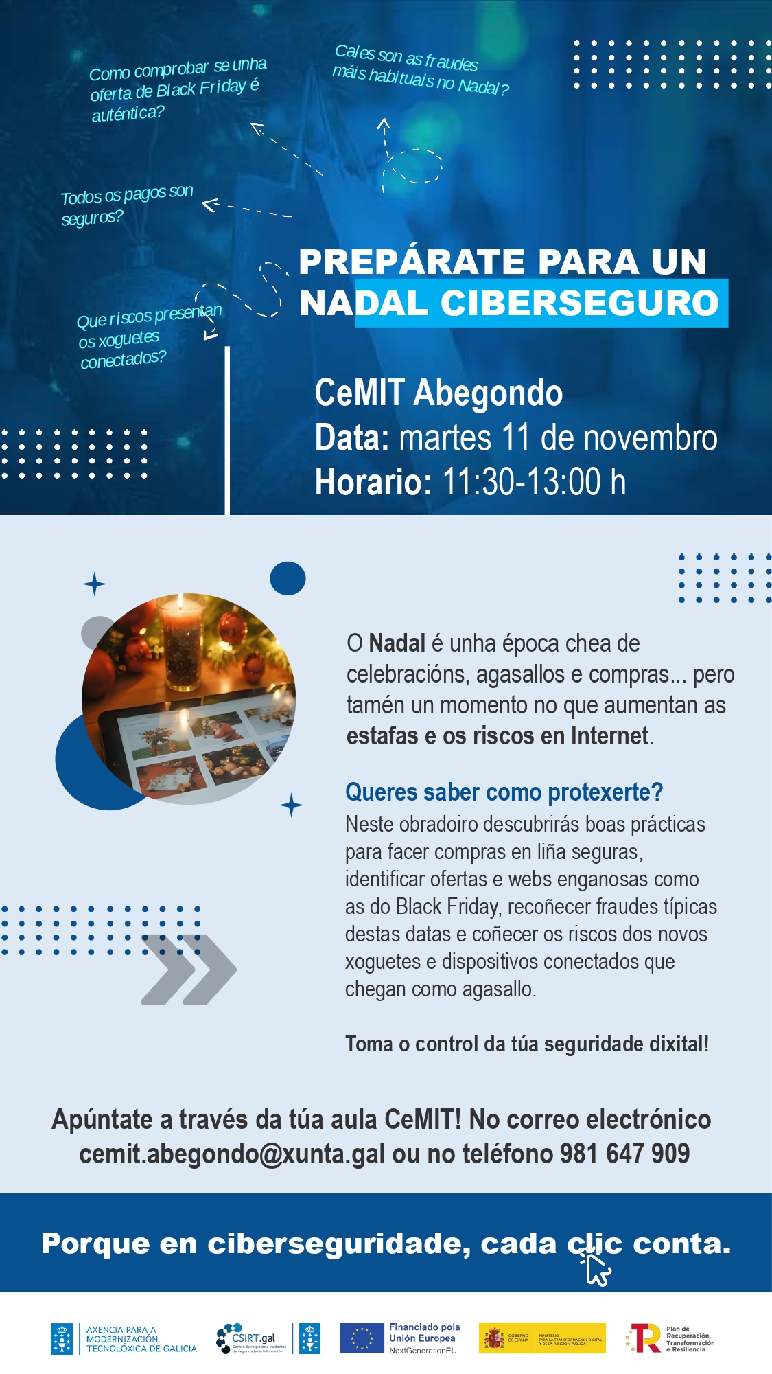 Baixo o lema ‘Prepárate para un Nadal ciberseguro’, o obradoiro abordará cuestións clave como comprobar se unha oferta de Black Friday é auténtica, garantir que os pagamentos sexan seguros, recoñecer as estafas máis habituais nestas datas e coñecer os riscos asociados aos xoguetes e dispositivos conectados que chegan como agasallo.