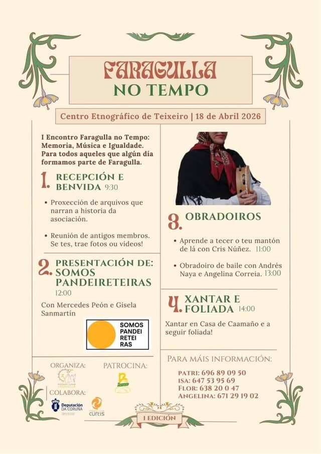 Desde esa mesma filosofía hai que entender o encontro 'Faragulla no Tempo', previsto para o 18 de abril de 2026 no Centro Etnográfico de Teixeiro. Non se presenta unicamente como unha cita festiva, senón como un acto de memoria e de reafirmación colectiva. Segundo relata Patricia Martínez, membro da asociación, a intención é reunir persoas de distintas etapas da historia da asociación, recuperar fotografías, vídeos, pezas, anécdotas e vivencias, e devolver protagonismo a aquelas mulleres que puxeron a primeira pedra do proxecto. O programa tamén reflicte esa vontade de abrir a tradición a máis dimensións: haberá recepción e benvida, a presentación de Somos Pandeireteiras con Mercedes Peón e Gisela Sanmartín, obradoiros e un xantar que rematará cunha foliada.