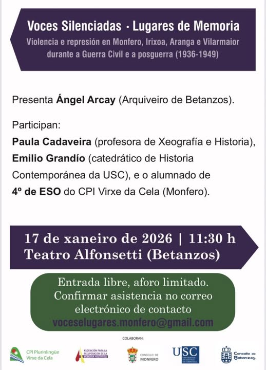 Betanzos será o punto de encontro para a presentación de ‘Voces silenciadas. Lugares de Memoria’, un proxecto que aborda a violencia e a represión exercidas durante a Guerra Civil e a posguerra (1936-1949) nos concellos de Monfero, Irixoa, Aranga e Vilarmaior.