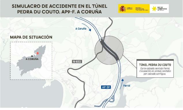 O Ministerio de Transportes e Mobilidade Sostible realizará esta noite un simulacro de accidente no túnel de Pedra do Couto, na autoestrada AP-9F ao seu paso polo municipio de Cabanas (A Coruña). O obxectivo é poñer a proba os protocolos de actuación e coordinación entre o persoal da infraestrutura e os servizos de emerxencia ante unha posible incidencia na galería.