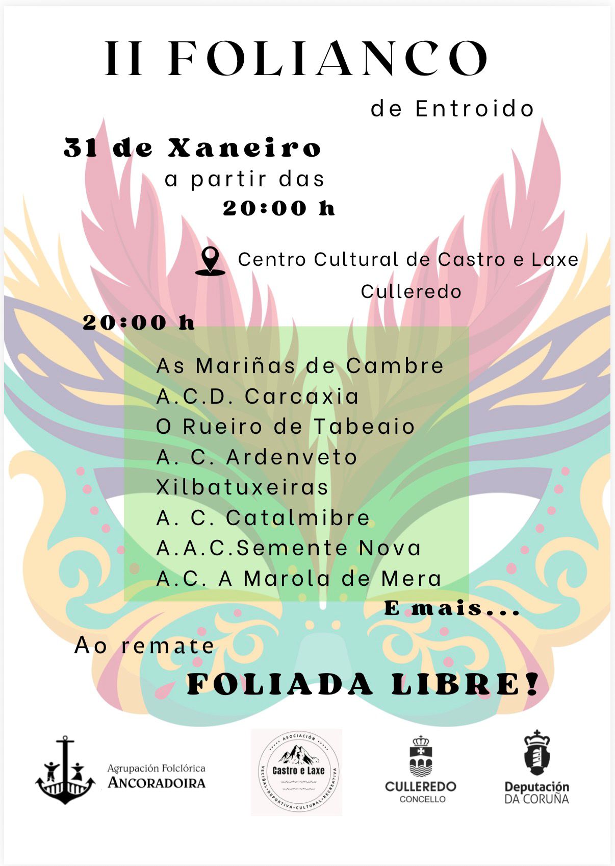 A Agrupación Folclórica Ancoradoira ultima os detalles do seu II Folianco de Entroido, unha xornada pensada para celebrar a música e o baile tradicional e abrir o Entroido cun encontro participativo. O evento terá lugar o vindeiro sábado 31 de xaneiro no Centro Cultural de Castro e Laxe, en Culleredo, a partir das 20.00 horas.