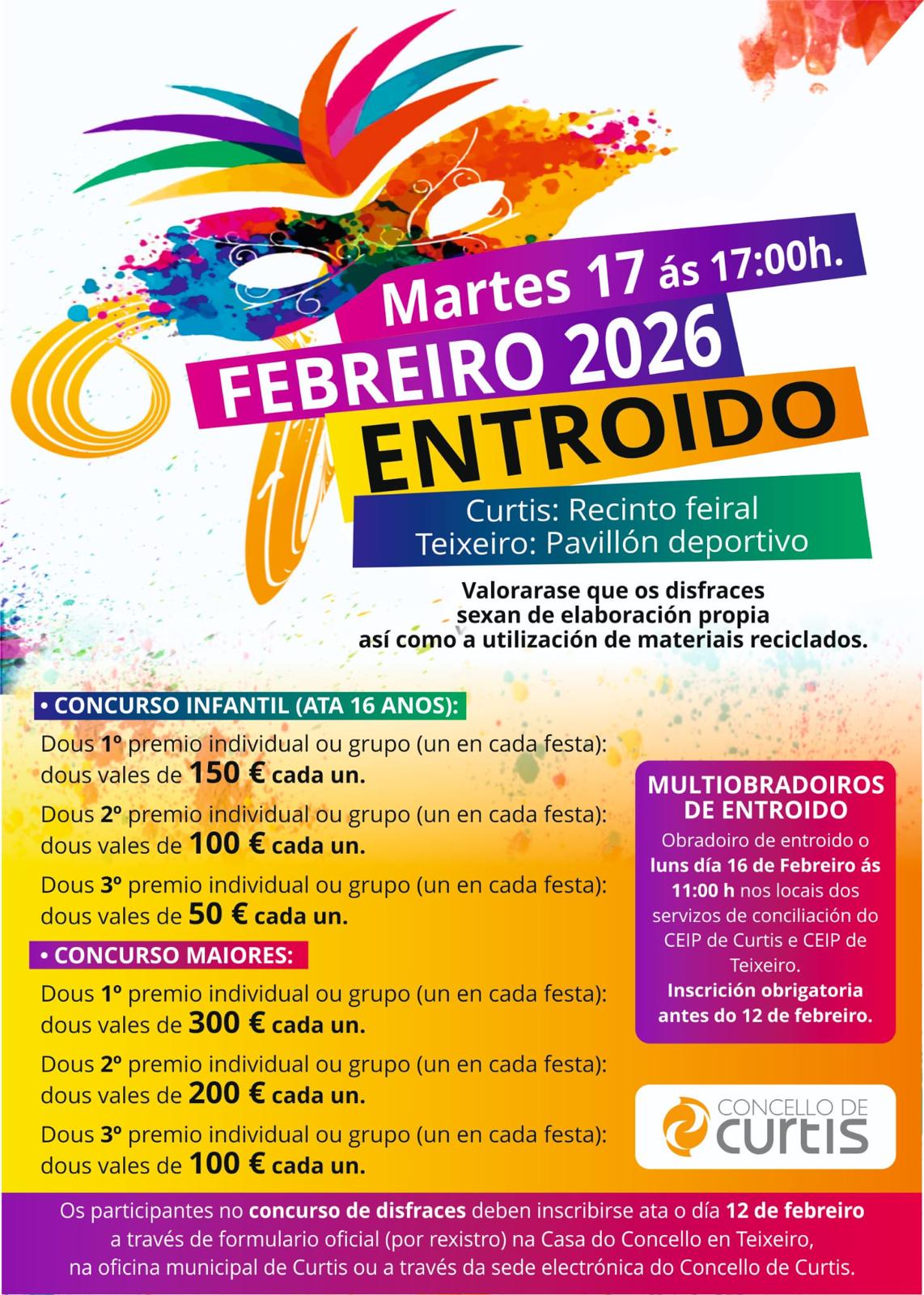 O Entroido 2026 xa ten data e formato no municipio de Curtis. A xornada central celebrarase o martes 17 de febreiro, desde as 17.00 horas, con dúas festas simultáneas: no pavillón deportivo de Teixeiro e no recinto feiral de Curtis, nas que haberá ambiente festivo e concurso de disfraces.