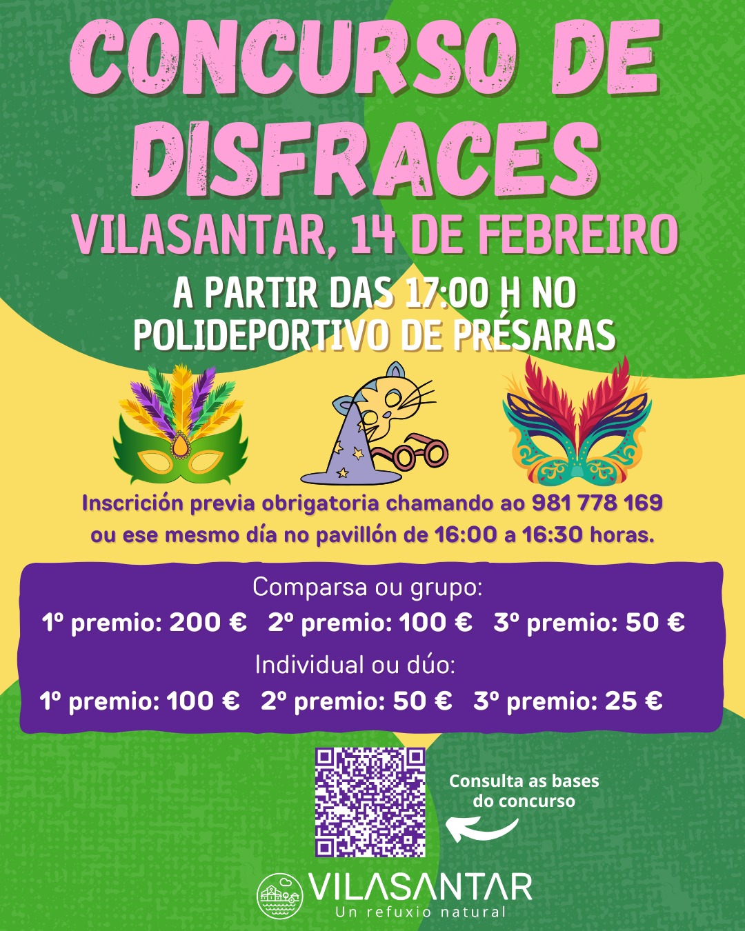 O Concello de Vilasantar volverá celebrar este ano o seu concurso de Entroido cunha tarde pensada para lucir creatividade, posta en escena e moita retranca. A convocatoria será o sábado 14 de febreiro, no pavillón polideportivo de Présaras, a partir das 17.00 horas.
