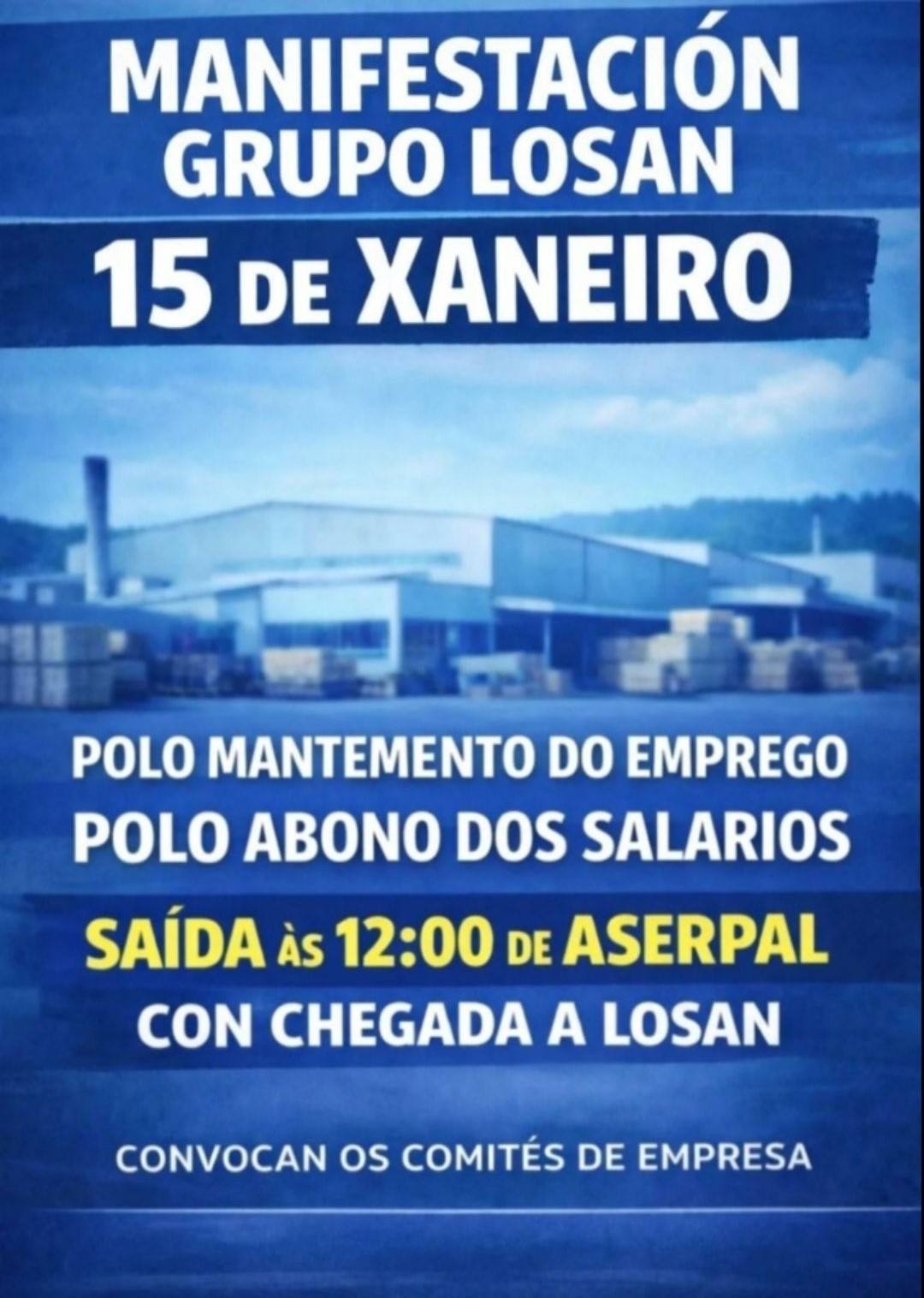 Traballadoras e traballadores do Grupo Losán, con presenza na provincia da Coruña a través das súas instalacións de Curtis e Vilasantar, teñen convocadas mobilizacións o 15 de xaneiro para denunciar o impago das dúas últimas nóminas e o que cualifican como un ‘deterioro irreversible’ da situación da compañía. As protestas están previstas ás 12.00 h e desenvolveranse de maneira simultánea en todos os centros de traballo do grupo.
