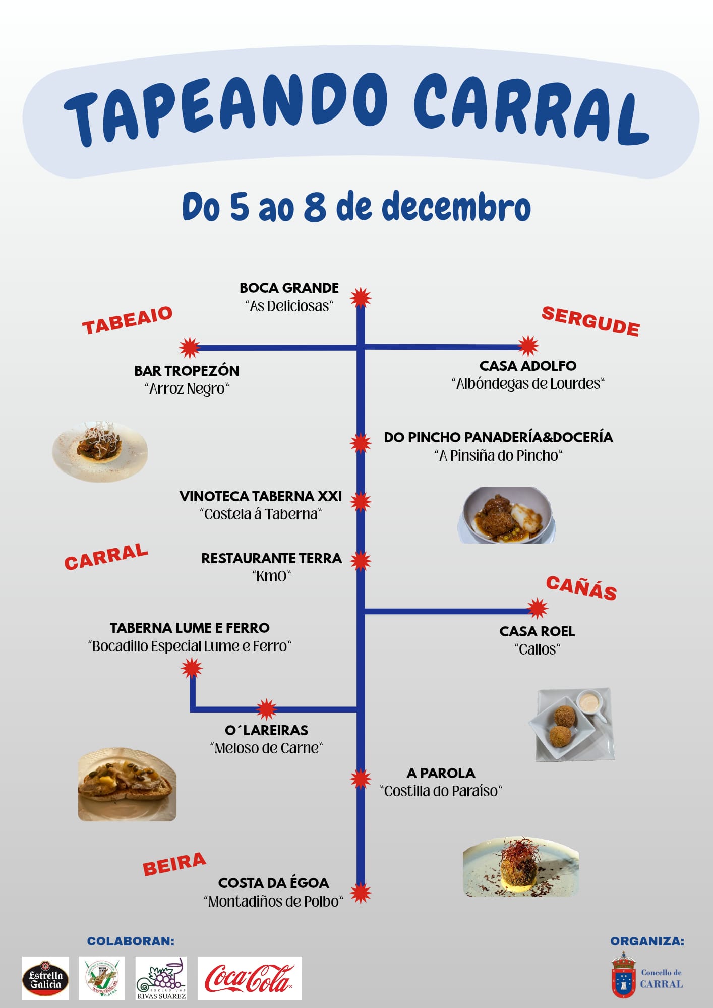 O Concello de Carral xa puxo data á nova entrega de 'Tapeando Carral', a súa ruta de tapas previa ao Nadal. O certame desenvolverase este ano entre o 5 e o 8 de decembro, coincidindo coa ponte festiva, co obxectivo de animar o consumo nos bares e restaurantes do municipio e de visibilizar a súa oferta gastronómica antes das festas.