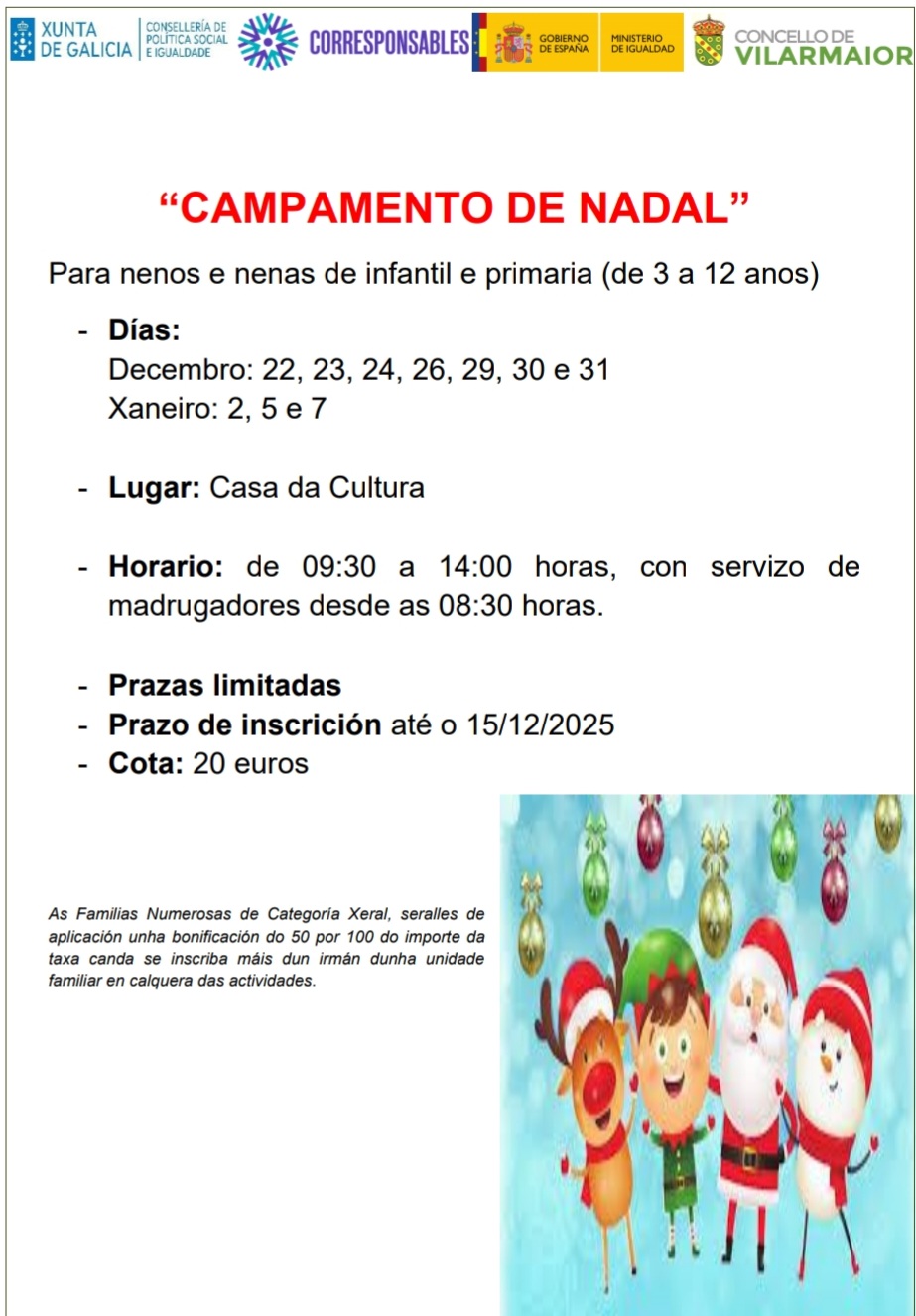 O Concello de Vilarmaior vén de poñer en marcha o proceso de inscrición para o Campamento de Nadal 2025/26, unha iniciativa destinada ao alumnado de educación infantil e primaria, con idades comprendidas entre os 3 e os 12 anos.