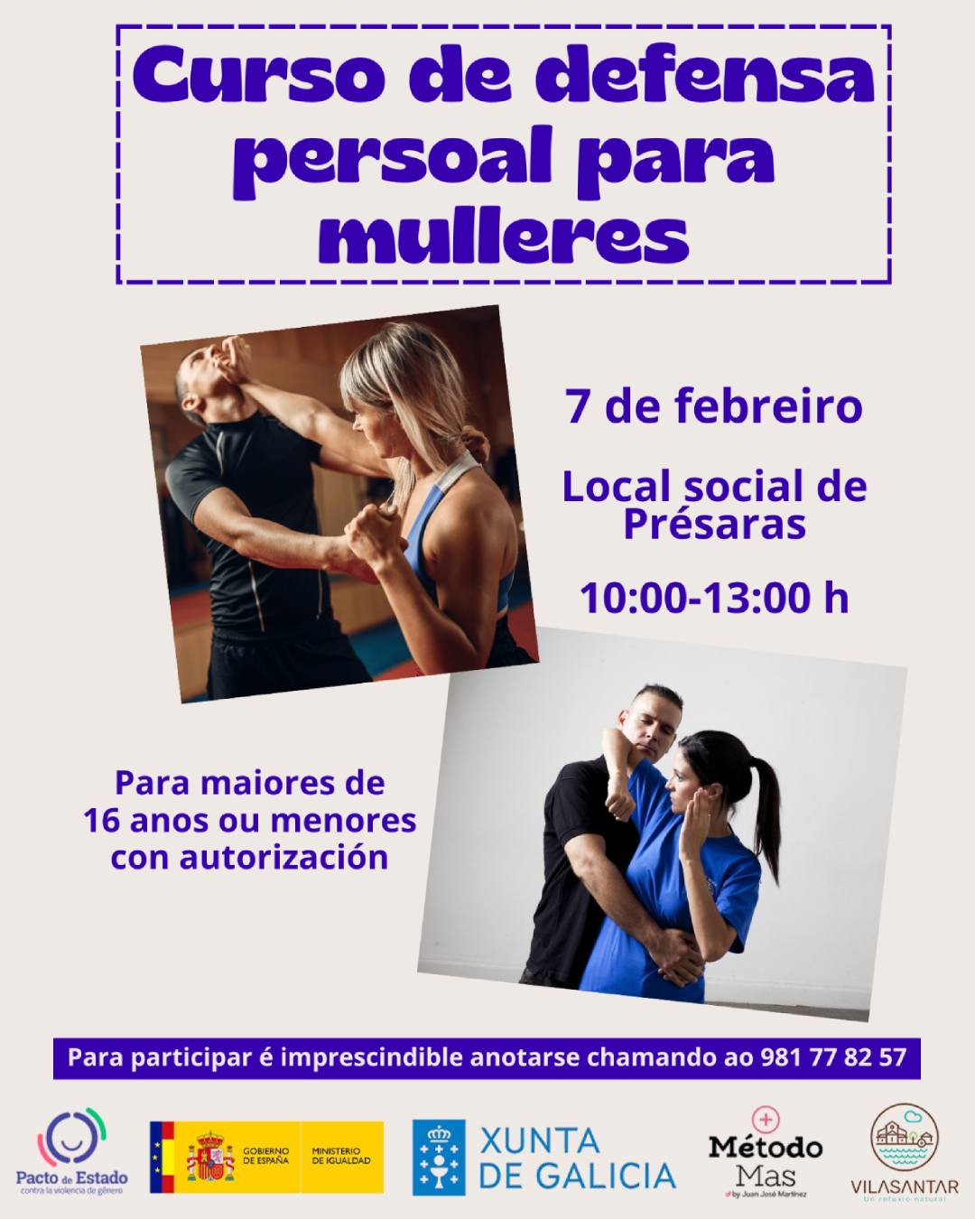 O Concello de Vilasantar promove un curso de defensa persoal para mulleres que terá lugar o sábado 7 de febreiro no local social de Présaras. A proposta desenvolverase en horario de mañá, de 10.00 h a 13.00 h, cun formato pensado para achegar ferramentas prácticas de autoprotección e reforzar a confianza persoal en situacións cotiás.