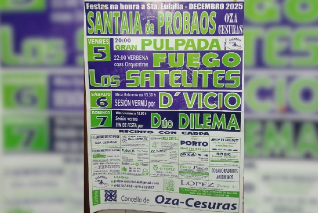 A parroquia de Oza-Cesuras celebrará do 5 ao 7 de decembro as Festas de Santaia de Probaos 2025, con pulpada popular, verbenas, sesións vermú e recinto con carpa